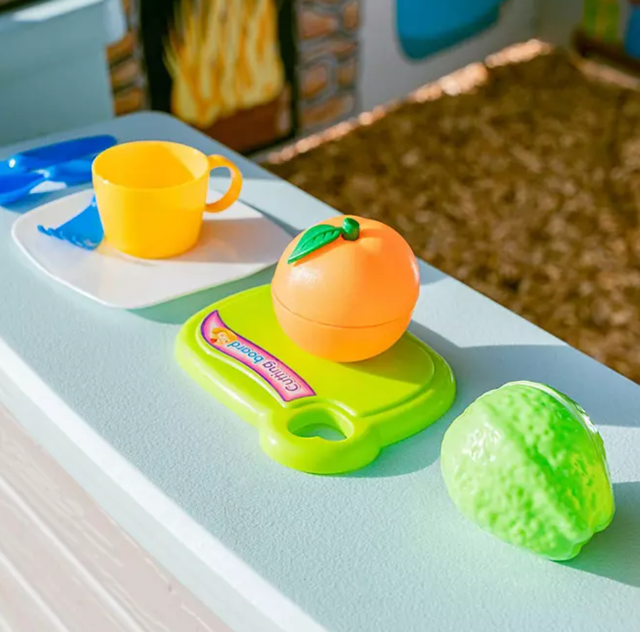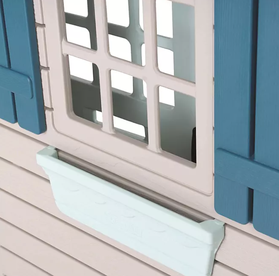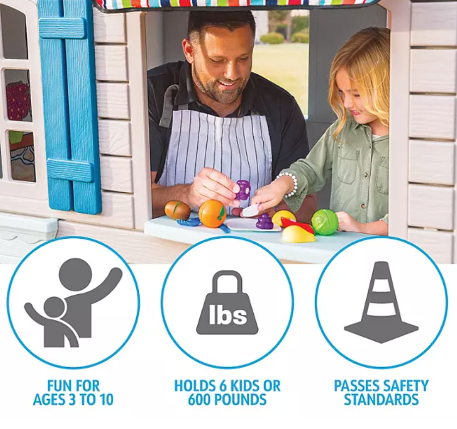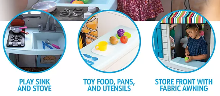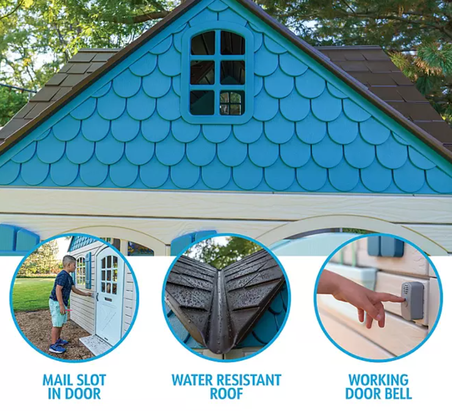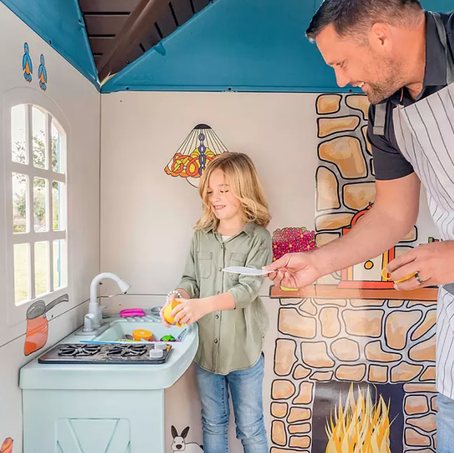 The playhouse comes equipped with a door that features a doorbell, storefront windows with shelves, and a sink with play dishes and food. These features add to the fun and make the playhouse feel like a real home. Your child will love playing house and engaging in imaginative play in their very own space.