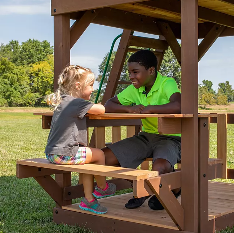 With a wood roof, covered entryway, a front porch, and bay windows, the Sky Wave Slide offers a welcoming escape. The lower deck features a snack stand and picnic table for al fresco meals, and the front porch has a sun balcony for soaking up the rays. A full length of monkey bars swings them straight up into the raised clubhouse, while the challenging rock wall allows them to climb directly onto the porch. And this personal playground set features a 10-foot wave slide that brings them right back down to start all over again. Two belt swings and a trapeze bar adds to their outdoor activities. With easy assembly supported by an interactive app, this handsome playset makes spending time outdoors active, engaging and fun.